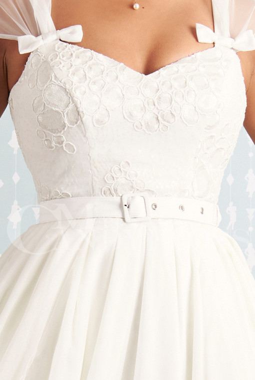 The bodice is adorned with intricate lace detailing, adding a touch of vintage sophistication and feminine allure.